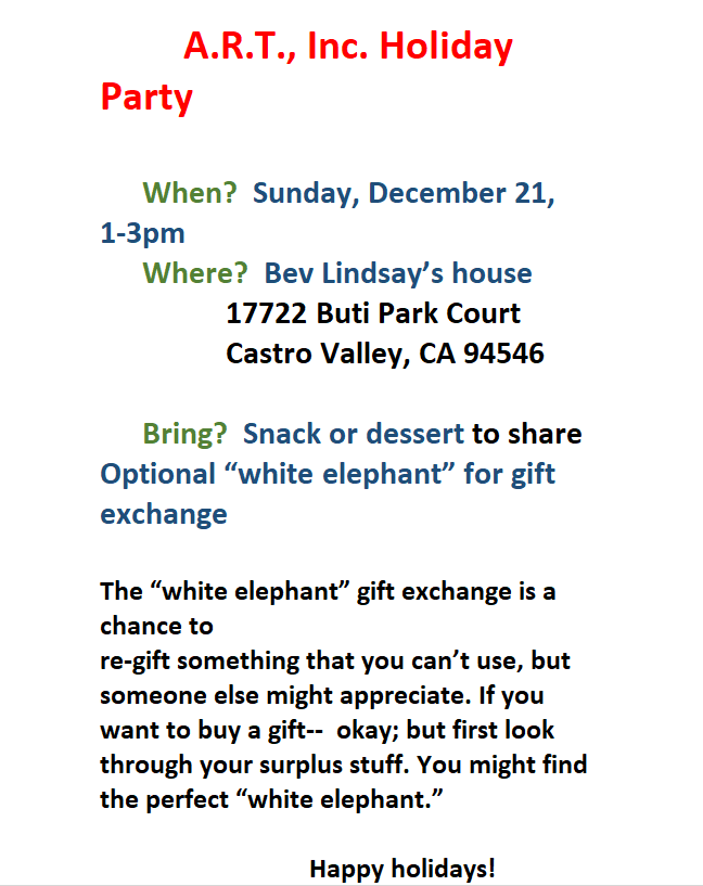 You’re invited to theA.R.T., Inc. Holiday Party When?Sunday, December 21, 1–3 pm Where?Bev Lindsay’s house17722 Buti Park CourtCastro Valley, CA 94546 Bring?Snack or dessert to shareOptional “white elephant” for gift exchange The “white elephant” gift exchange is a chance to re-gift something that you can’t use, but someone else might appreciate. If you want to buy a gift—okay; but first look through your surplus stuff. You might find the perfect “white elephant.” Happy holidays!